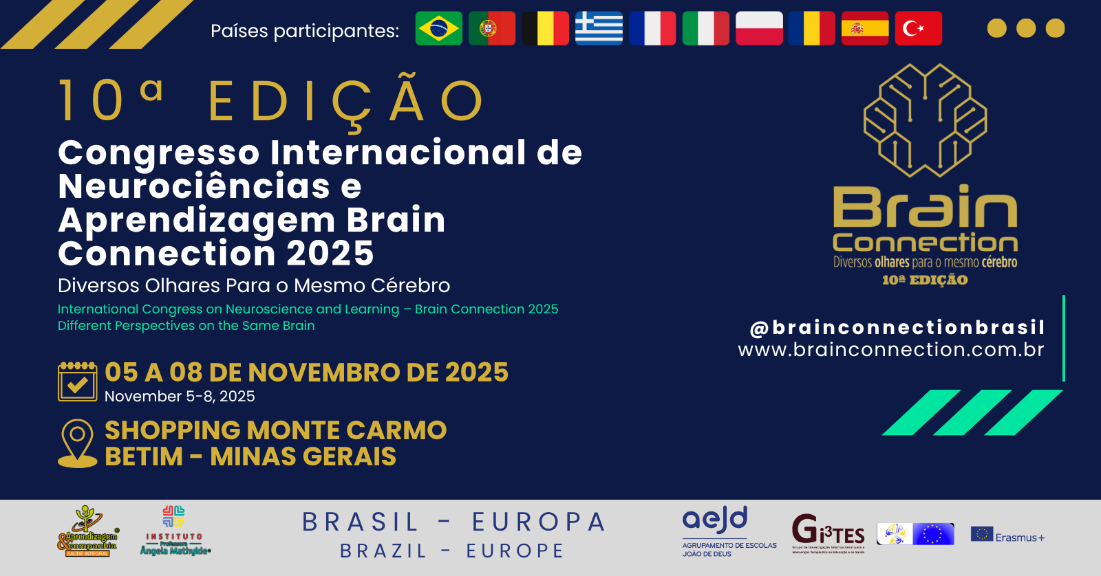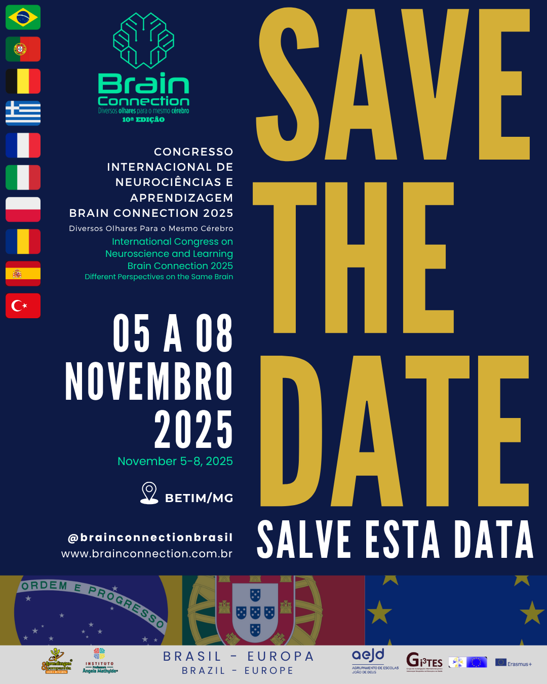Chancelado pelo Erasmus+, pela OMNES PRO UNO e pelo Agrupamento João de Deus (Portugal), e realizado no Brasil pelo Instituto Professora Ângela Mathylde Soares – IPAMS e pela Clínica Aprendizagem & Companhia, o Brain Connection é o encontro de quem sonha grande e age maior ainda.