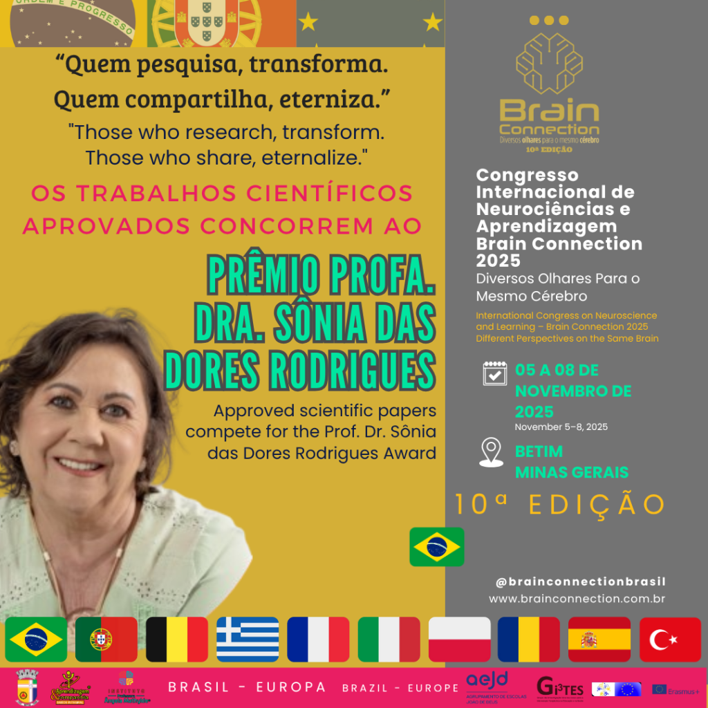 O Brain Connection 2025 tem a honra de apresentar o Prêmio Profa. Dra. Sônia das Dores Rodrigues, concedido aos trabalhos científicos que expressam, com excelência, a ética, a paixão pelo conhecimento e o compromisso com a transformação social por meio da ciência.