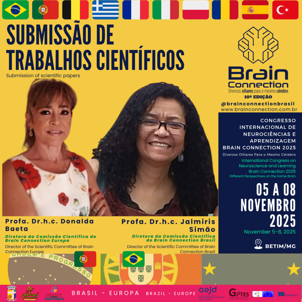 - Ao submeter um trabalho, os(as) autores(as) autorizam sua reprodução, por via impressa ou digital, em publicações ligadas às entidades promotoras e apoiadoras do 10º Congresso Internacional de Neurociências e Aprendizagem Brain Connection 2025/Betim-MG, bem como a associação de sua imagem aos referidos trabalho e evento.